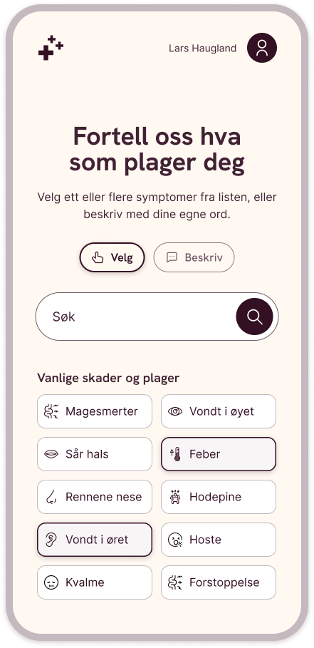Til slutt får du anbefalinger om hva du bør gjøre videre – enten det er egenomsorg, fastlege, legevakt eller annen oppfølging.